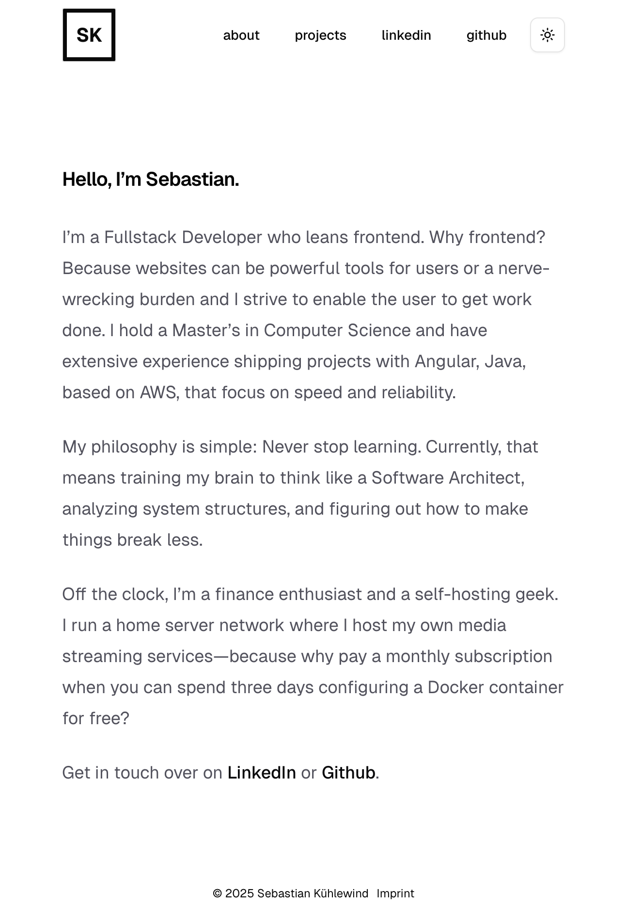 This site is a portfolio-style showcase built to give recruiters and collaborators a glimpse into who I am, what I can do, and what I’ve worked on so far. It highlights some of my skills, past projects, and the technologies I’ve been learning, with a focus on clean structure and a modern, responsive UI. The site is developed with Next.js and TypeScript, using shadcn/ui components for a consistent component system and Tailwind CSS for fast, flexible styling. It also serves as a contact hub, making it easy to find and reach me via LinkedIn and GitHub (and possibly via an email form in the future). Since it was my first project with Next.js, I used AI to generate code snippets and achieve quick iterations.